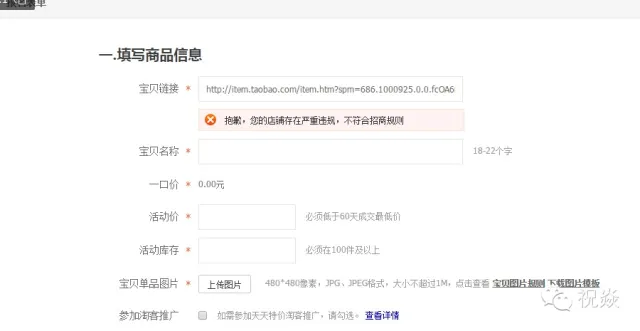 在报名页面填写宝贝链接后,系统会自动校验您是否符合报名条件,不符合的会在页面提示具体不符合原因,如下图: