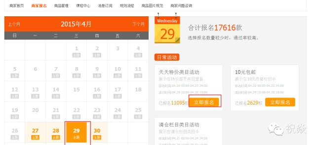 1、如何报名:报名入口:点击链接:http://tejia.taobao.com/rule/calendarNew.htm ,选择可报名日期下的活动,点击“立即报名“,如下图。