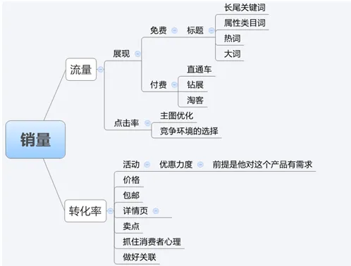 因为 销量=流量 X 转化率 那我们把流量和转化率都提高了,销量自然而然的就上去了。下面我们对这个公式进行分解: