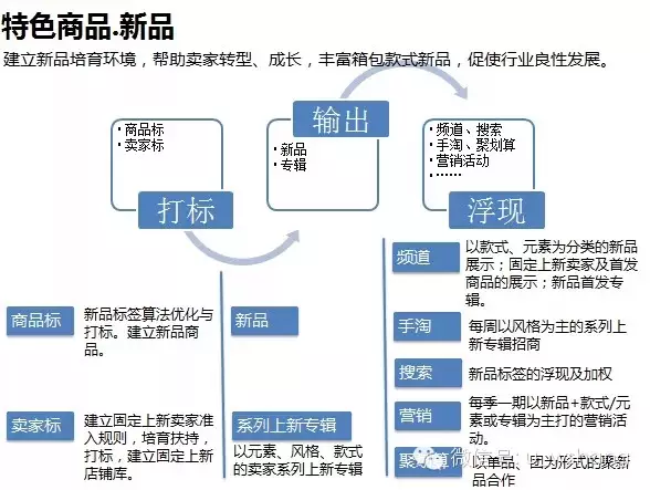 第一个方面即为打造不同类型的商家标杆。这些标杆商家主要来自于两个群体,一个是来自有货源的全球购的卖家,尤其是男鞋这个类目。另一个群体就是有潜力的值得培养和扶持的淘品牌卖家,这些商家群体可能来自于转型商家,原来淘品牌商家和有供应链支撑的大厂直供商家。