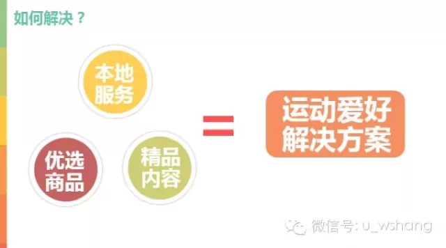 所有的过程中,都逃不开内容资讯和服务商品两大方面的支撑。因此,淘宝要做的其实是一个运动爱好的解决方案,能够非常简便地解决消费者的需求。在这个解决方案中包含了三个元素:本地服务、优选商品、精品内容。