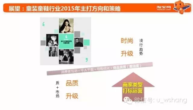淘宝母婴-童装童鞋行业负责人陶楚(花名)透露,童装童鞋行业2015年策略主要分三部分,品质升级、时尚升级和商家运营。